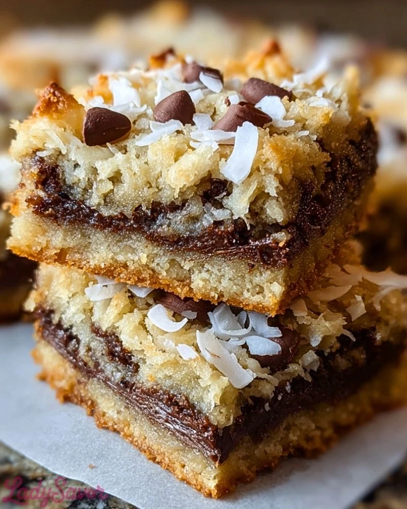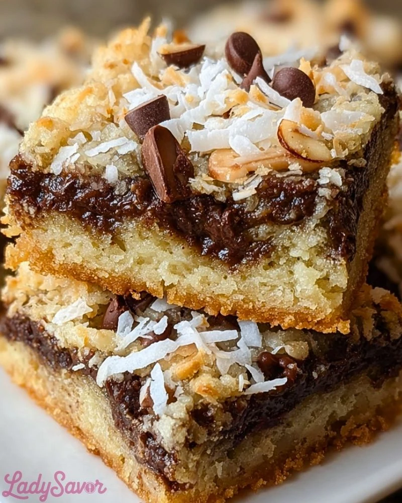 These bars are the perfect mix of chewy, gooey, and crunchy. You get that melt-in-your-mouth cookie layer, swirls of melty chocolate chips, bites of roasted almond crunch, and a snowy coconut topping that toasts just slightly as it bakes. They’re portable, sliceable, and honestly addictive.