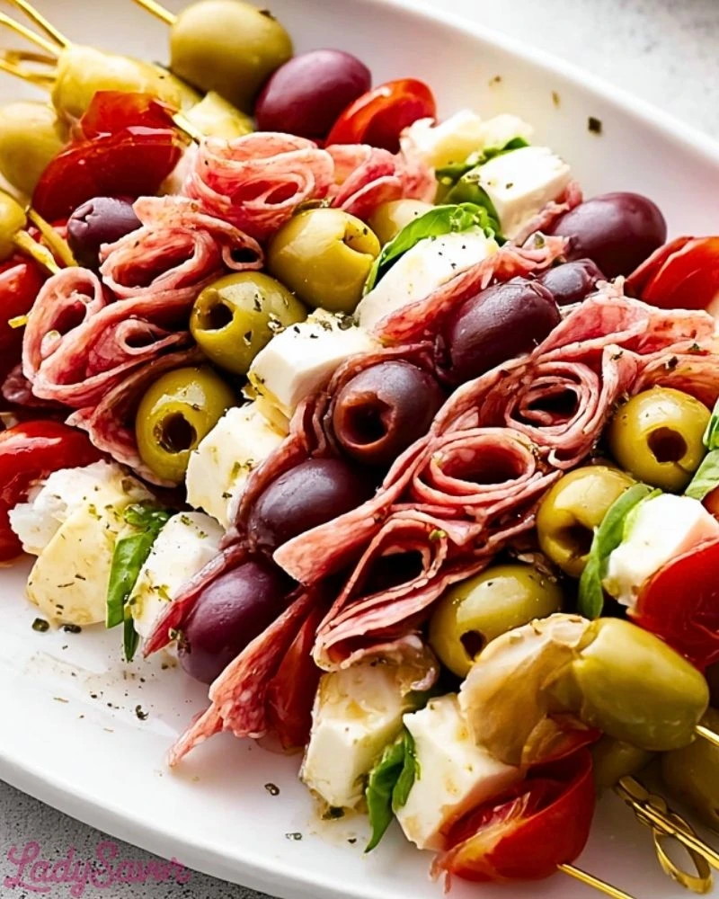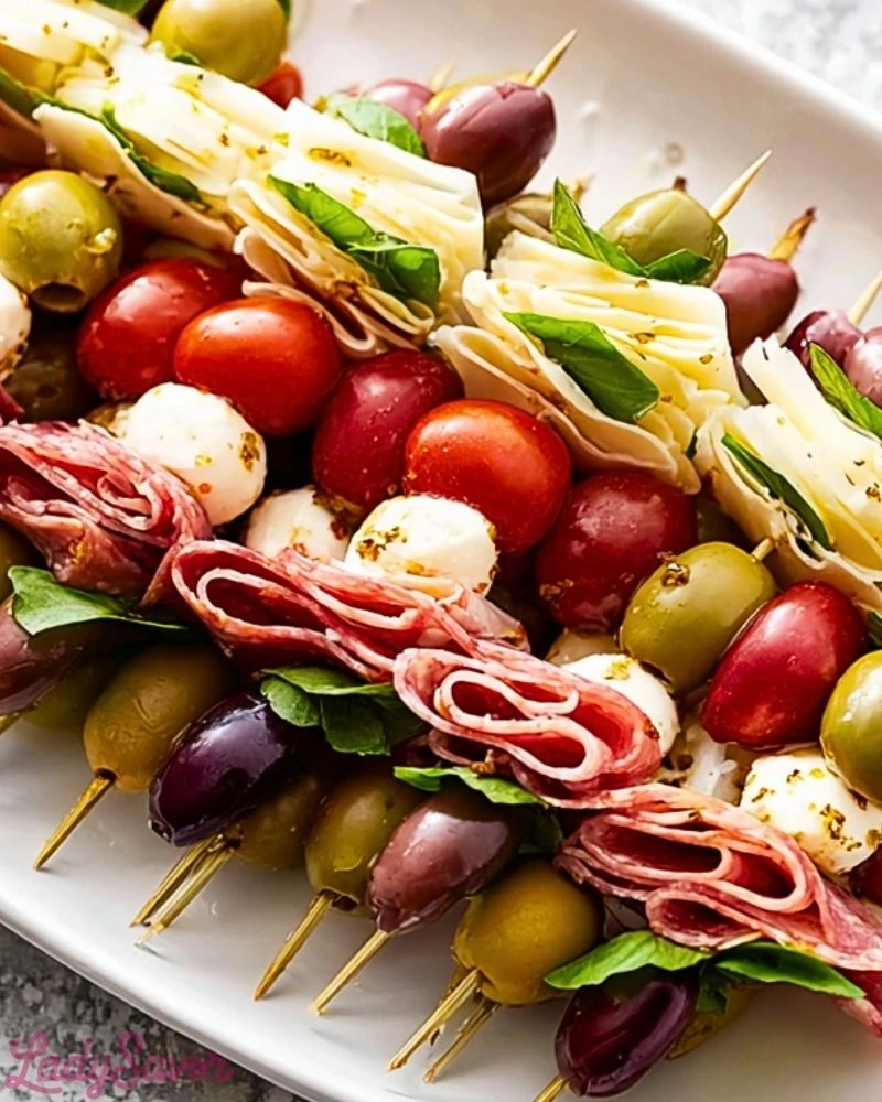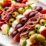 Don’t have salami or cherry tomatoes? No problem. Swap in pepperoni, prosciutto, or cubed cheese. Try roasted red peppers instead of artichokes, or cucumber slices instead of basil. Vegan? Skip the cheese and meat, and double up on marinated veggies, olives, and pickles. The key is balance—mix bold, briny, creamy, and crisp ingredients for the best result.