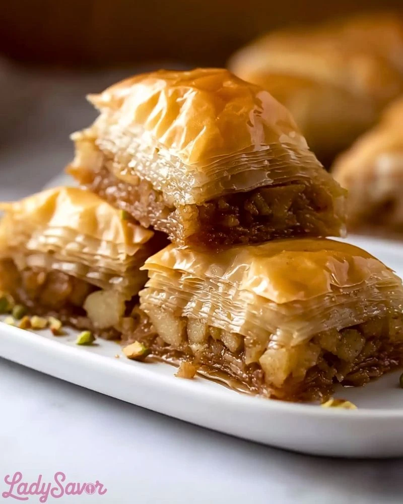 A golden fusion of flaky Middle Eastern pastry and classic American apple pie, Apple Pie Baklava with Maple Syrup is the ultimate comfort-meets-elegance dessert. This easy recipe layers crisp phyllo sheets with cinnamon-spiced apples and crushed nuts, soaked in a rich maple glaze that brings cozy fall flavor in every bite. Perfect for quick breakfast indulgence, unique dessert ideas, or easy holiday dinner treats, this fusion dish is a must-try for lovers of bold yet familiar flavors.