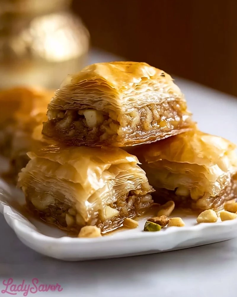 To create this beautiful dessert, you’ll need a few key tools. A sharp knife is essential for slicing the baklava both before and after baking — precision matters here for clean, neat portions. A pastry brush helps you apply melted butter evenly between the phyllo layers, which is crucial for that golden flakiness. You’ll also want a large baking dish (typically 9×13 inches) to hold all those layers in place and bake them evenly. Lastly, a saucepan is needed to prepare the maple syrup glaze.