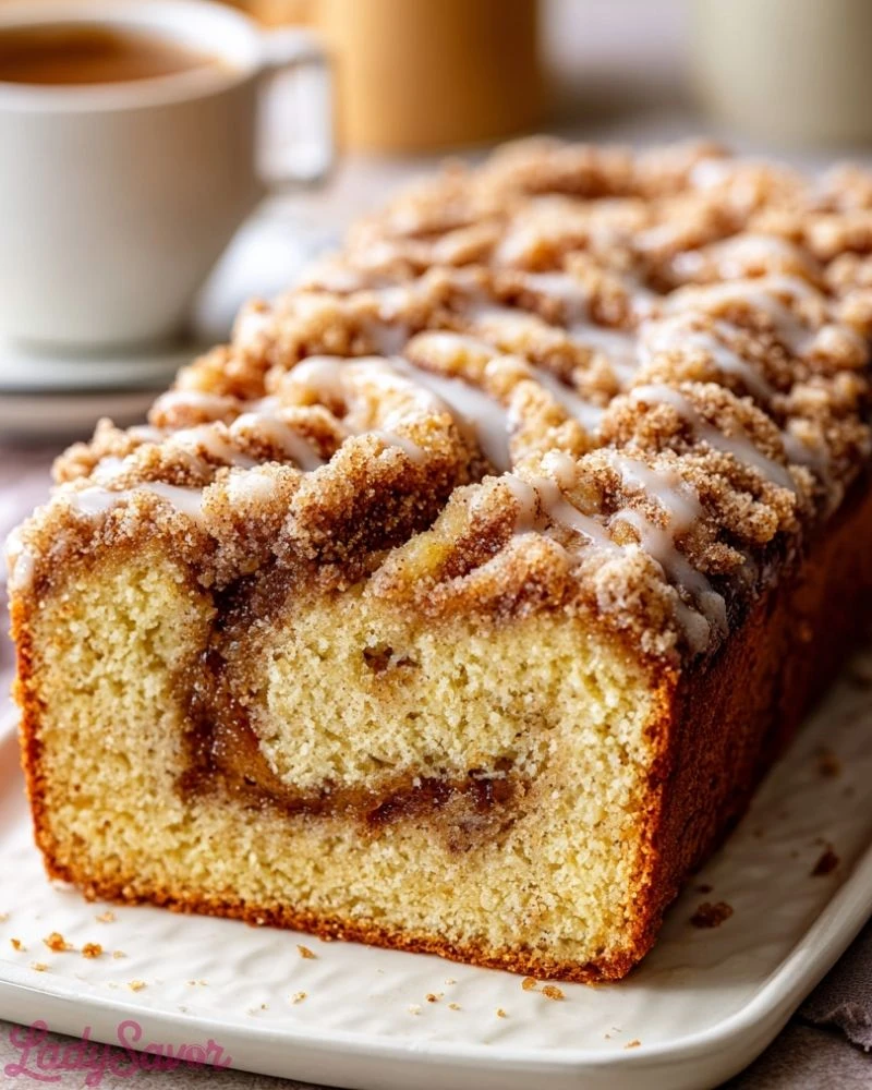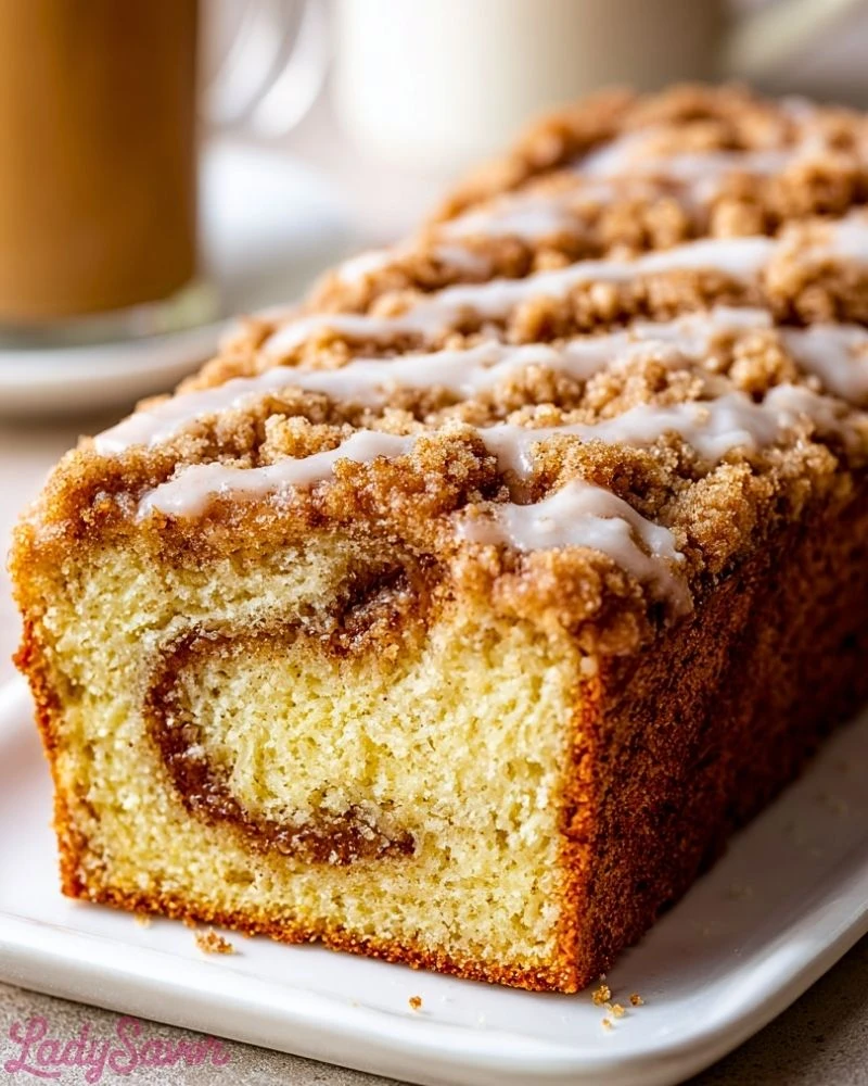 - Moist, tender crumb with a ribbon of cinnamon swirl through the middle.