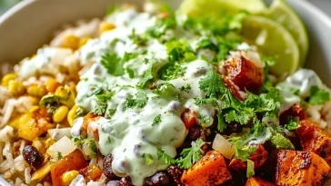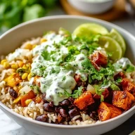 • Black Bean and Rice Bowl with Cilantro Lime Yogurt Sauce