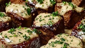 • Tender Steak Bites in Garlic Butter with Creamy Parmesan Sauce