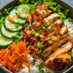 Ideal for a quick weeknight dinner or meal prep lunch, the Bang Bang Chicken Bowl comes together with surprising ease. Every element is packed with flavor: the tangy cucumbers, the crisp lettuce, the shredded carrots, and of course, that unforgettable sauce. It’s comforting yet refreshing, indulgent yet light—a perfect example of how delicious a rice bowl can be.
