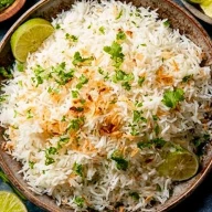 Fluffy rice cooked in coconut milk gives a subtle sweetness and creamy texture that complements the sauce beautifully.