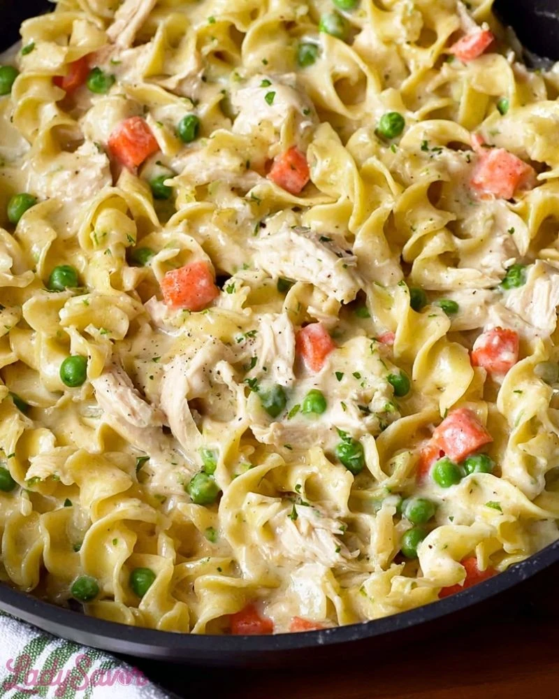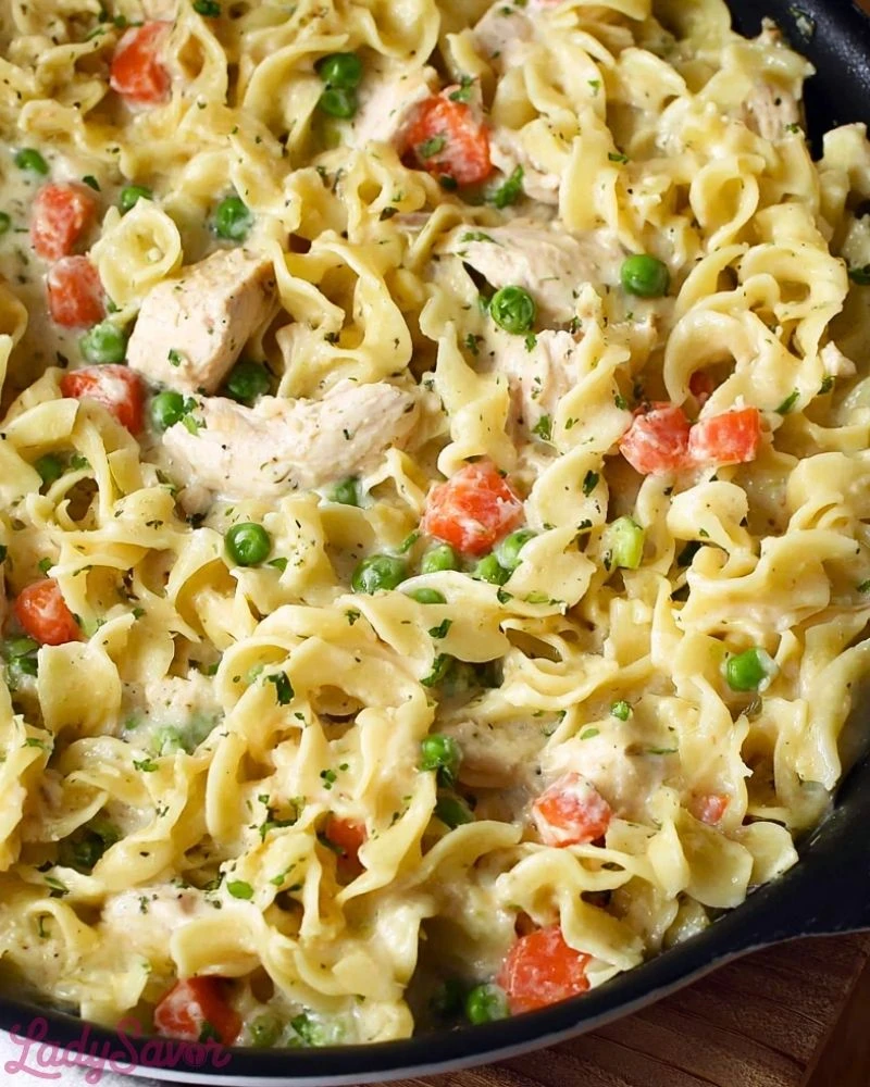 To keep this recipe truly easy and fuss-free, use pre-cooked rotisserie chicken—just shred it ahead of time. You can also buy pre-chopped frozen vegetables or a frozen pea and carrot mix to cut down on prep. Make sure to sauté your vegetables until they’re just tender for the best texture, and don’t overcook the noodles—they’ll continue to absorb the sauce even after the heat is off. If the mixture looks too thick, a splash of milk or broth will loosen it right up.