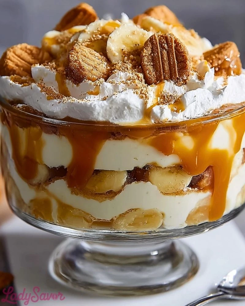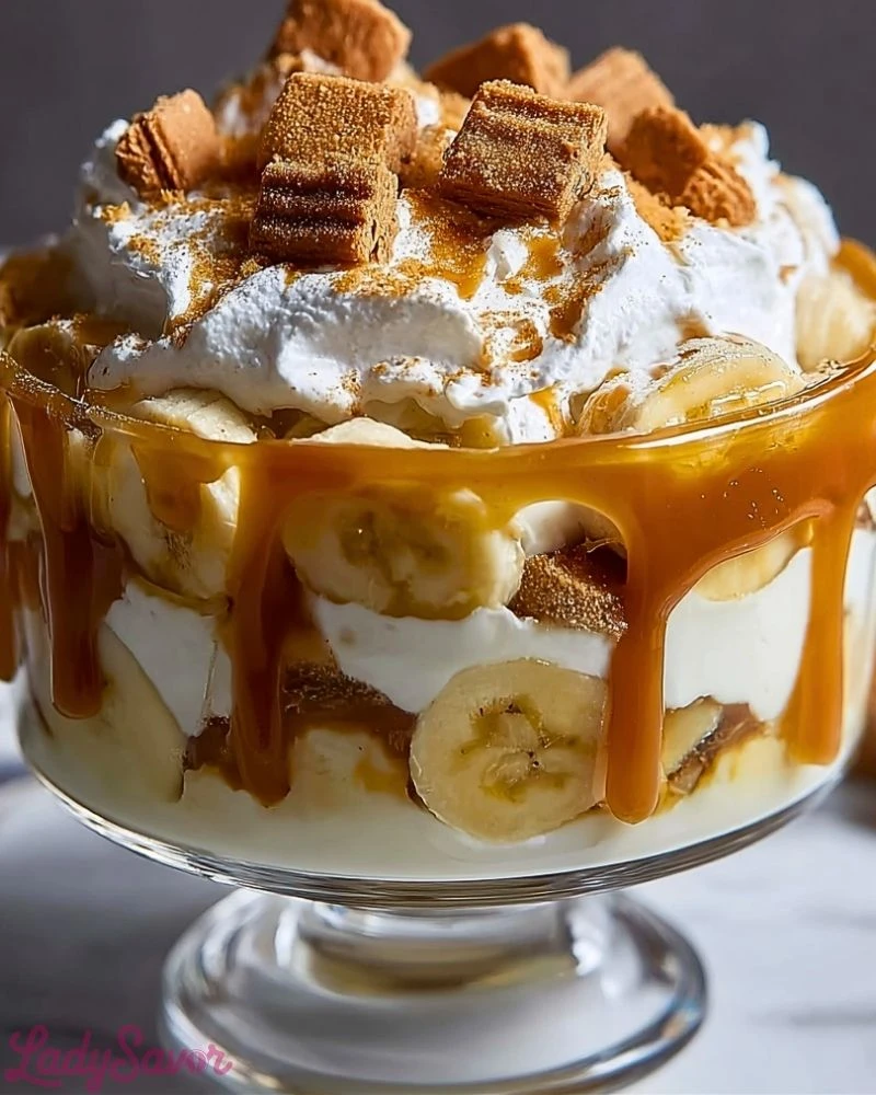 I first made this on a whim for a family gathering, and I barely had time to refrigerate it before everyone was digging in. The creamy layers of vanilla pudding and whipped topping blend beautifully with ripe bananas and the crunch of Biscoff cookies, but what really takes it over the top is the buttery caramel that seeps into every layer. Trust me, once you try this, you’ll never go back to plain banana pudding again.