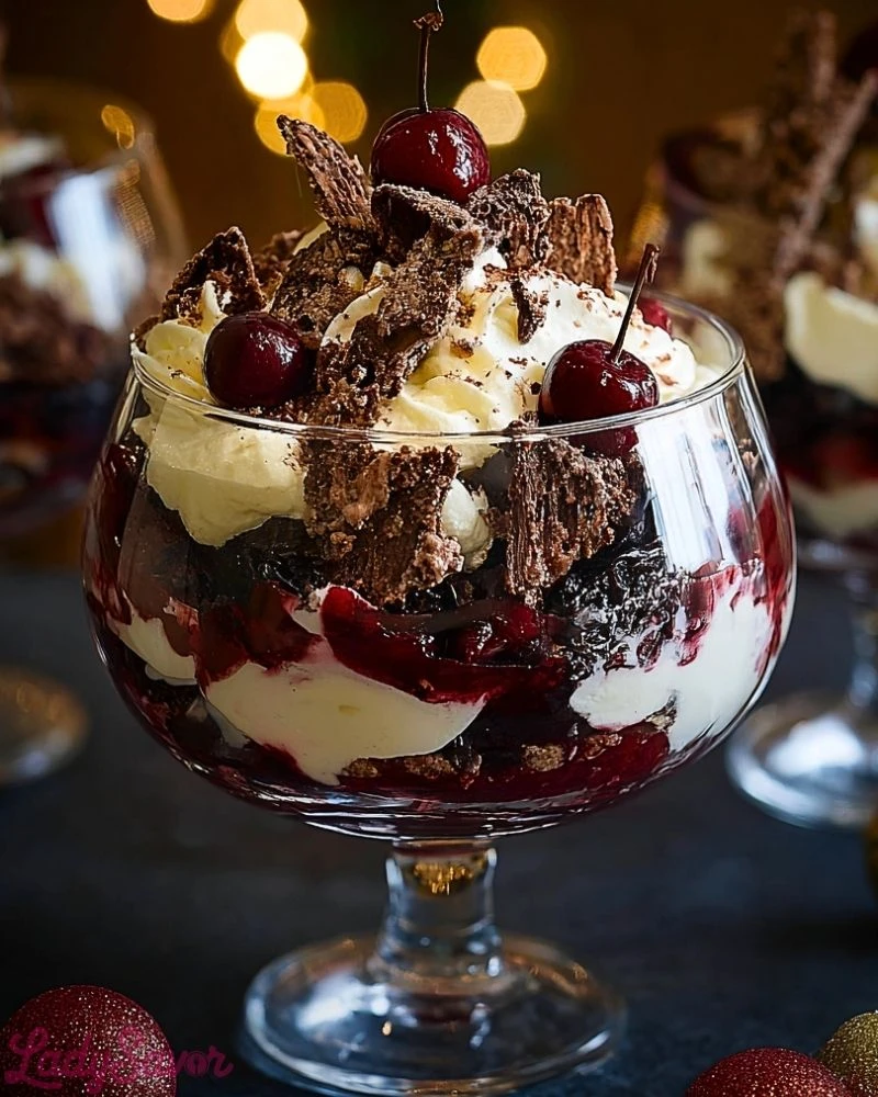 Keywords: black forest trifle, Christmas dessert, easy trifle, chocolate cherry dessert, holiday recipe