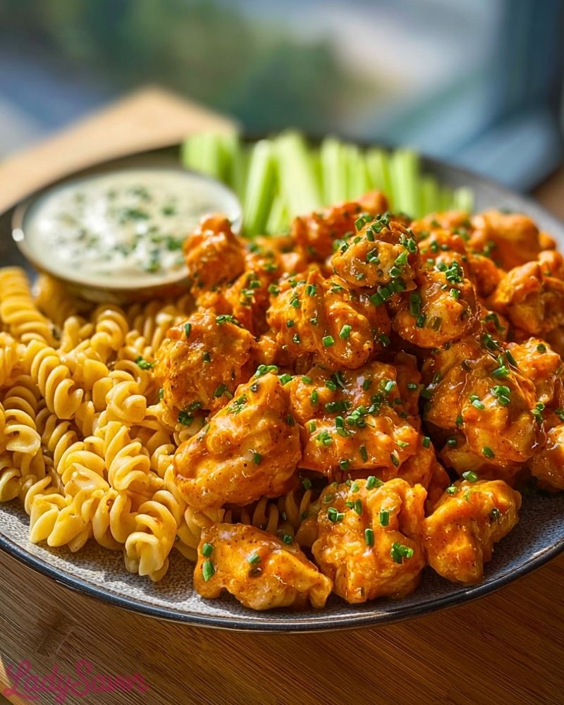 8. Plate the pasta, top with buffalo chicken bites, garnish with parsley, and serve with celery and extra ranch if desired.
