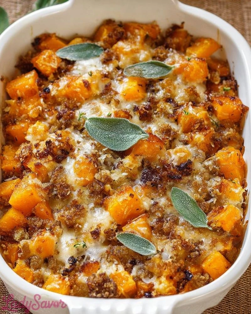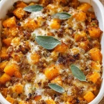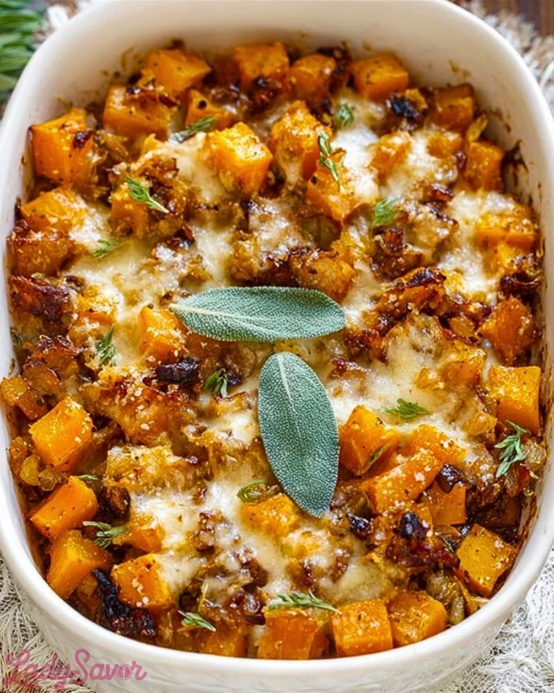This casserole is packed with flavor and texture — tender chunks of roasted butternut squash, caramelized onions, melted cheese, and a fragrant blend of spices. It’s comforting without being too heavy, and it fits right into a variety of dietary preferences. You can make it vegetarian, gluten-free, or give it a protein boost by adding sausage or ground turkey. It’s a true crowd-pleaser for any table.