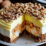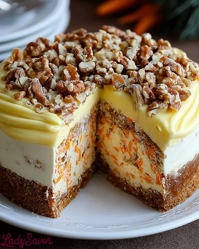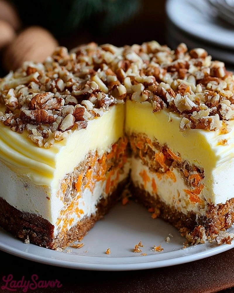 What I adore most about this cake is that it doesn’t just taste incredible — it looks stunning too. With layers of moist carrot cake swirled with cheesecake and a silky cream cheese topping, it’s perfect for holidays, birthdays, or just a weekend baking adventure. Topped with chopped pecans and a touch of spice, every slice feels like a celebration.