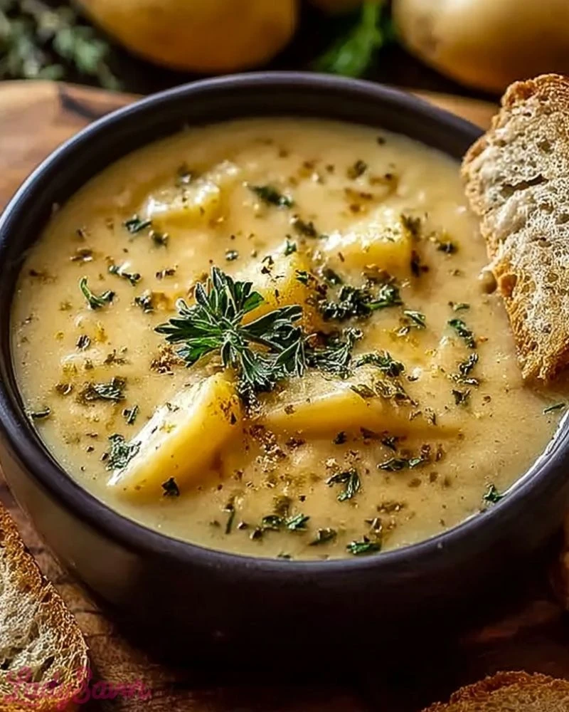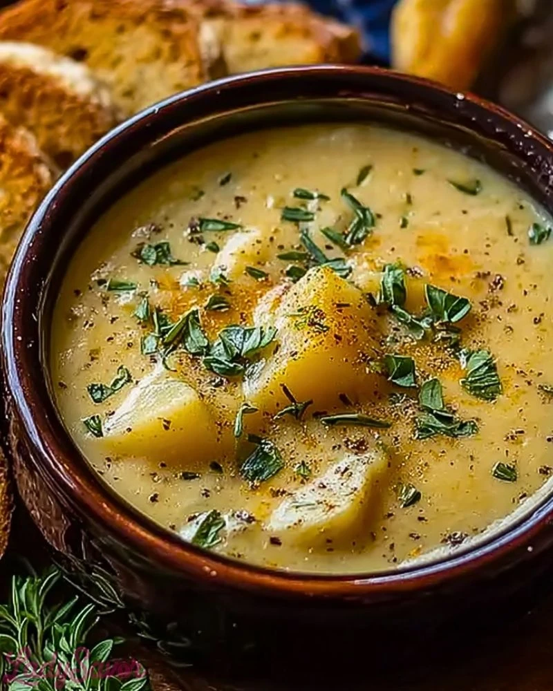 Keywords: cheddar potato soup, garlic herb soup, easy dinner, cozy meals, creamy potato soup