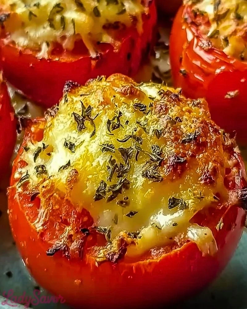 8. Arrange tomatoes in a baking dish. Bake for 20–25 minutes, or until the cheese is golden and bubbly.