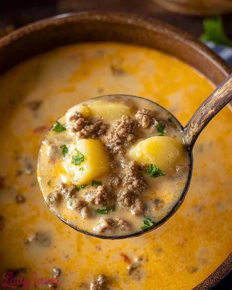 Keywords: cheesy soup, beef and potato soup, easy dinner, comfort food, hearty soup, one pot meal, kid-friendly, quick weeknight recipe
