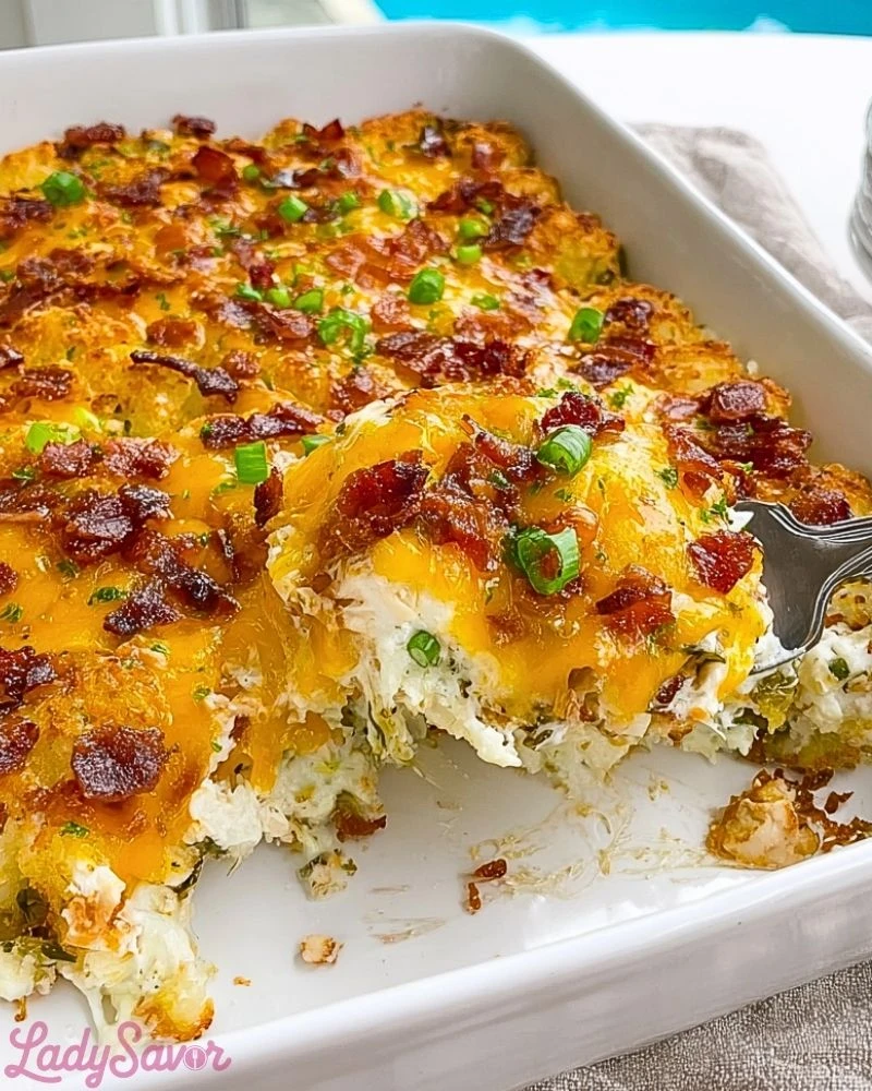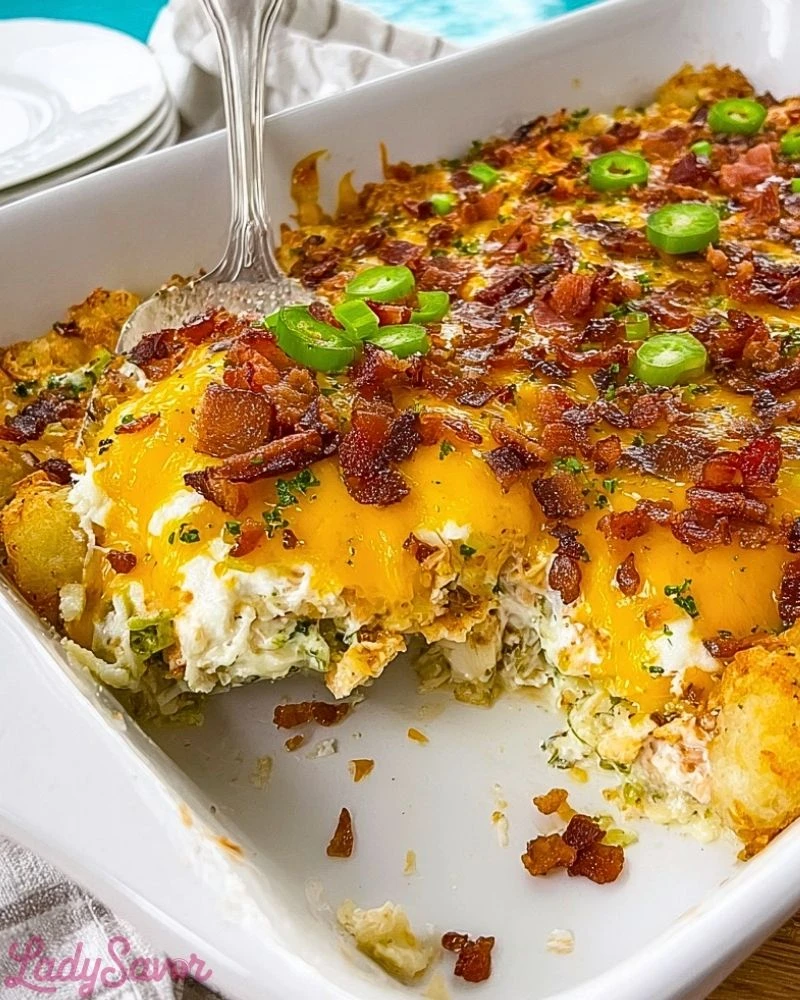 The magic really lies in the layers. Juicy chicken forms the base, while a creamy sauce ties everything together. Then comes the star: golden tater tots that crisp up beautifully in the oven. Add a generous layer of melted cheese and a sprinkle of savory toppings, and you’ve got a dish that’s both comforting and crave-worthy.