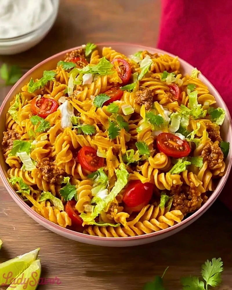 Cheesy Taco Pasta Salad is more than just a side dish—it can stand alone as a complete meal. The taco-seasoned beef adds a rich, savory depth that pairs beautifully with the tang of tomatoes, the crunch of lettuce, and the creaminess of shredded cheese and sour cream. The pasta gives it structure and staying power, making it both satisfying and filling. It’s a great recipe to make ahead, and leftovers taste just as good the next day. Plus, it’s endlessly customizable based on your favorite taco toppings or what you have in the fridge.