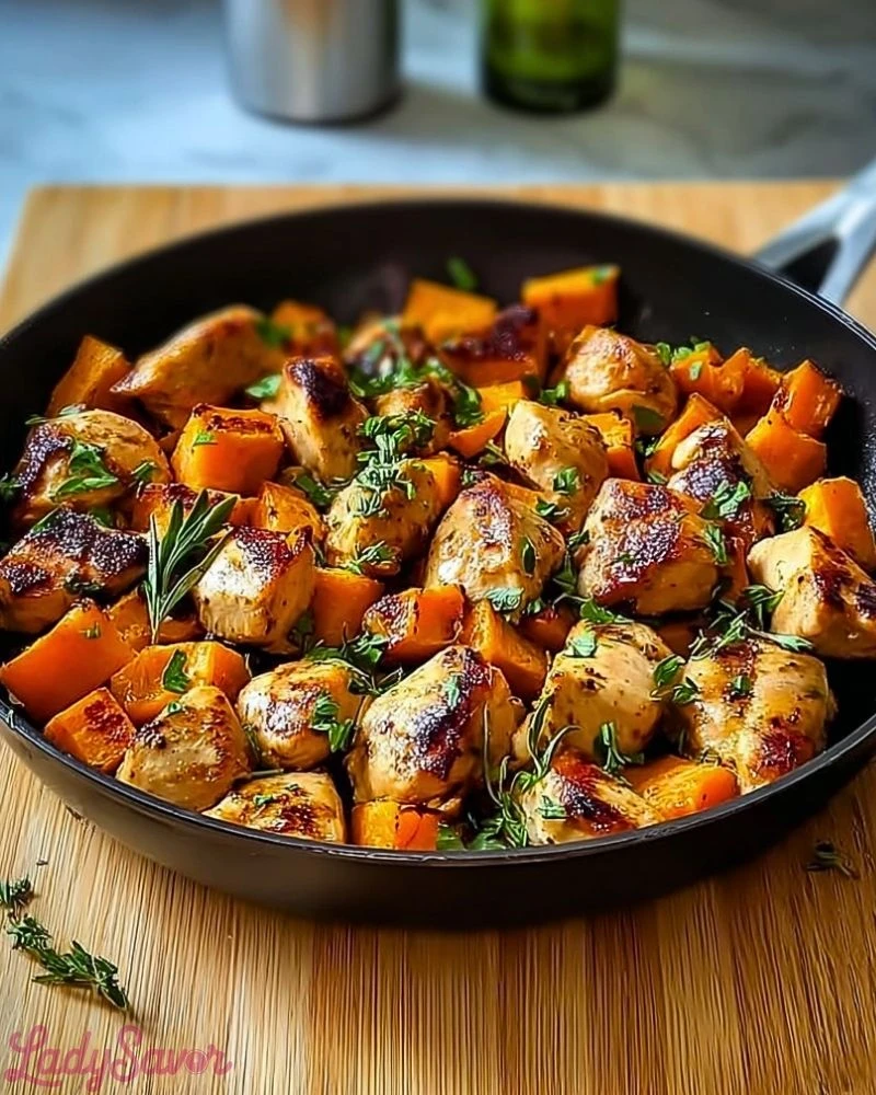 Return the sweet potatoes to the skillet with the cooked chicken. Toss everything together gently to mix. If using, stir in a tablespoon of butter for a silkier finish. Cook for another 2–3 minutes to reheat the sweet potatoes and allow flavors to meld.