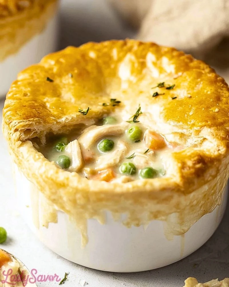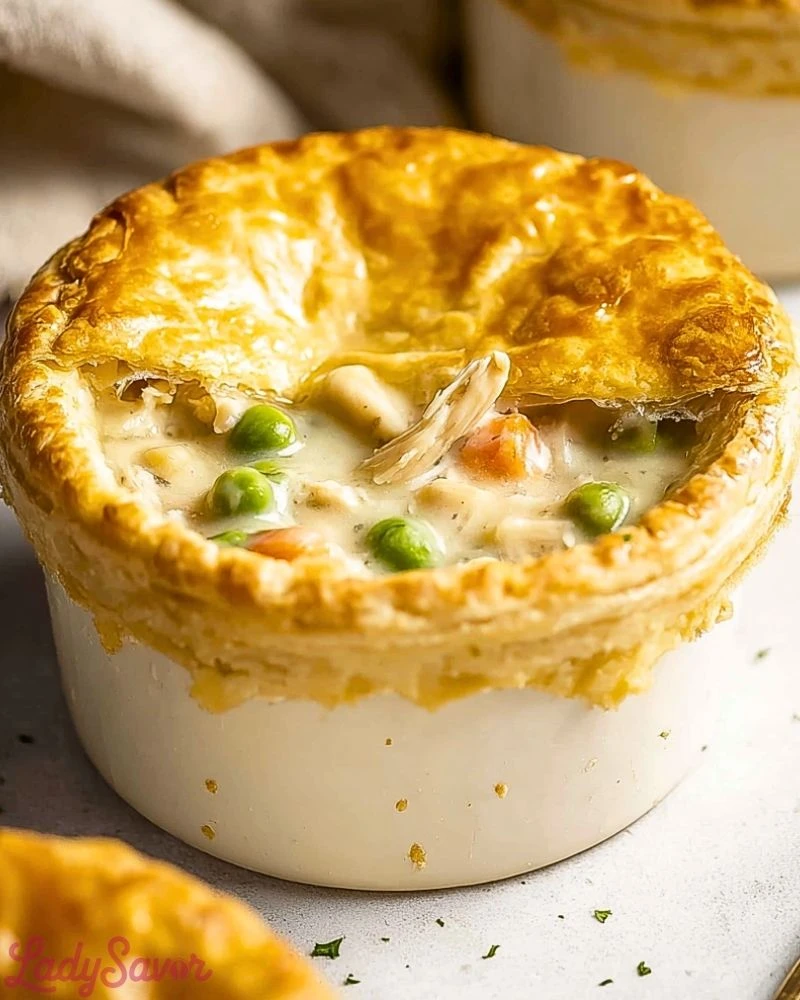 Allow the Chicken Pot Pie to rest for 5-10 minutes before serving. This helps the filling set and avoids burning your mouth on the first bite!