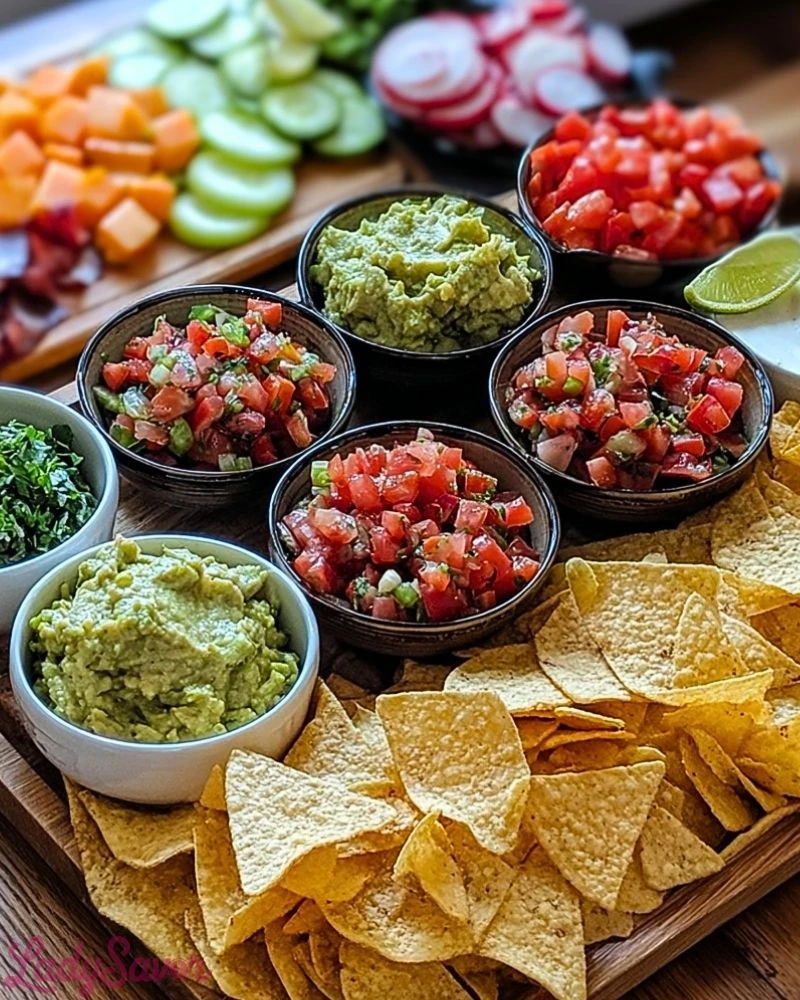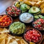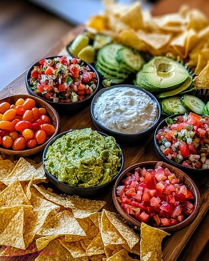 Imagine crisp tortilla chips nestled next to bowls brimming with chunky guacamole, zesty salsa, cooling sour cream, and a rainbow of fresh pico de gallo and diced vegetables. It’s a customizable, interactive eating experience that encourages sharing, dipping, and repeat trips back to the board. Easy to prepare and endlessly versatile, it’s perfect for any occasion.