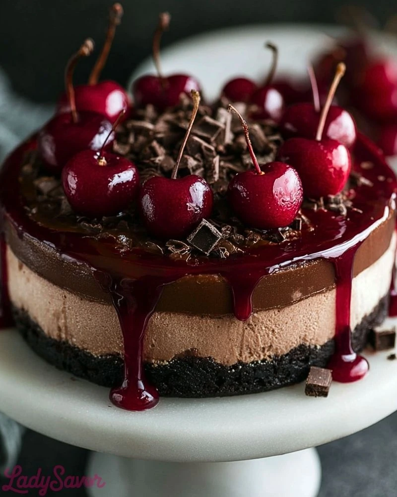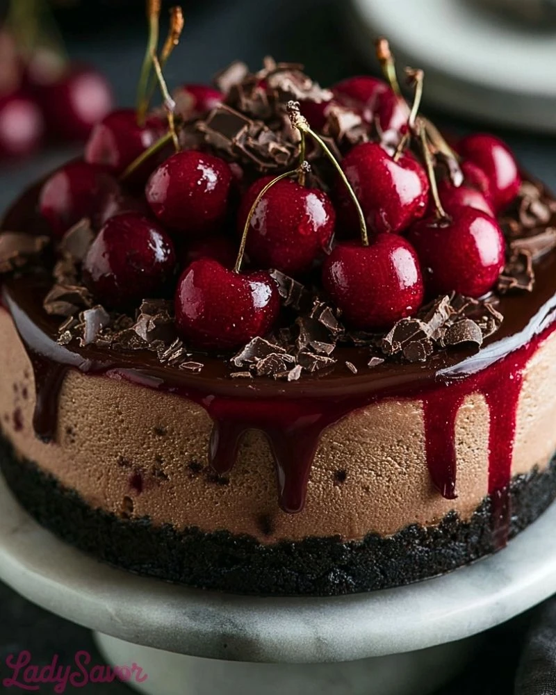- Keywords: No-bake cheesecake, chocolate cherry dessert, easy holiday dessert, no oven, creamy cheesecake