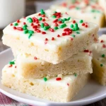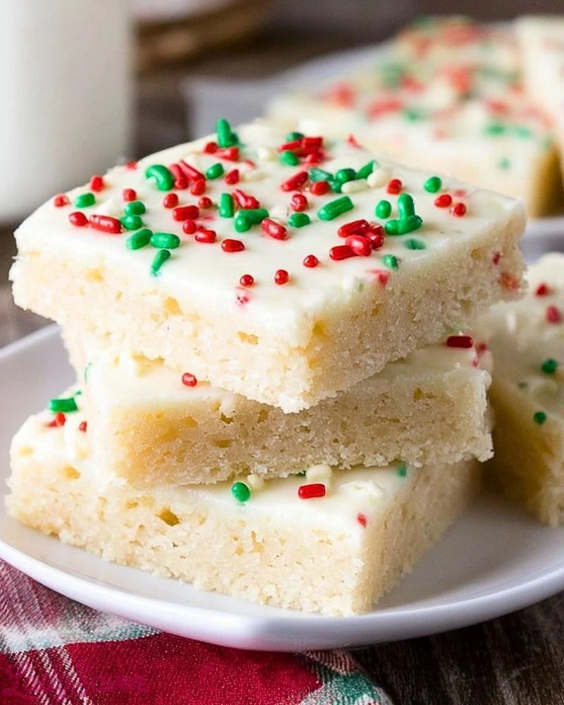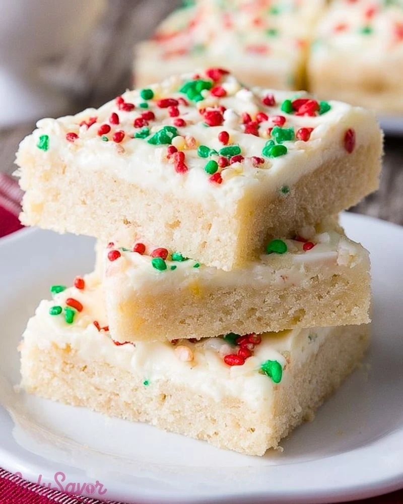 These bars are incredibly soft and tender with a rich buttery flavor that melts in your mouth. The creamy frosting adds just the right amount of sweetness, while the festive sprinkles make them perfect for any holiday celebration. Plus, they’re easy to slice and serve, making them ideal for parties and cookie exchanges.