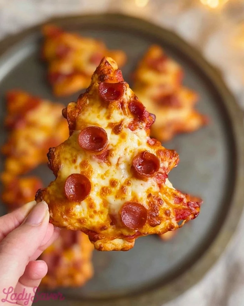 Top with mini pepperoni slices, placing them carefully to maintain the tree silhouette. You can also add your own twist: chopped olives, bell peppers, or even pineapple if you like.