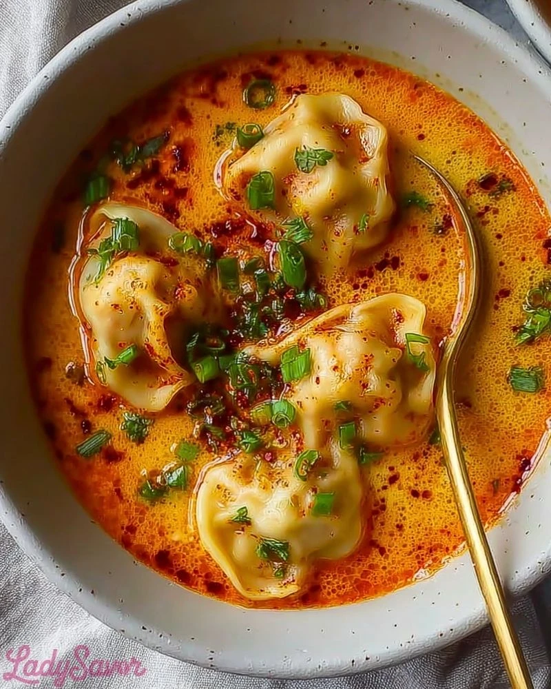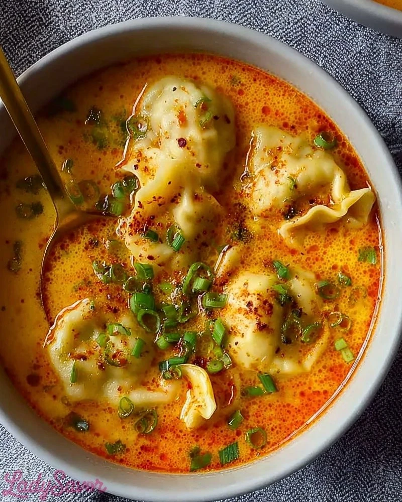 This soup is highly customizable. You can make it spicier by adding extra curry paste or a dash of chili flakes. If you’re vegetarian or vegan, stick to veggie dumplings and use vegetable broth. The soup base can also be made ahead and stored in the fridge for up to 3 days before adding dumplings fresh. The balance of creamy, spicy, salty, and tangy elements is key — don’t skip the lime juice or soy sauce.