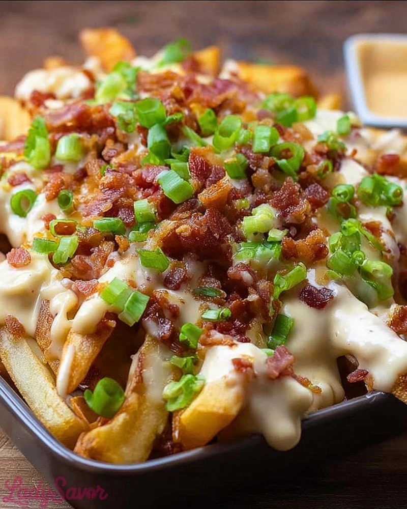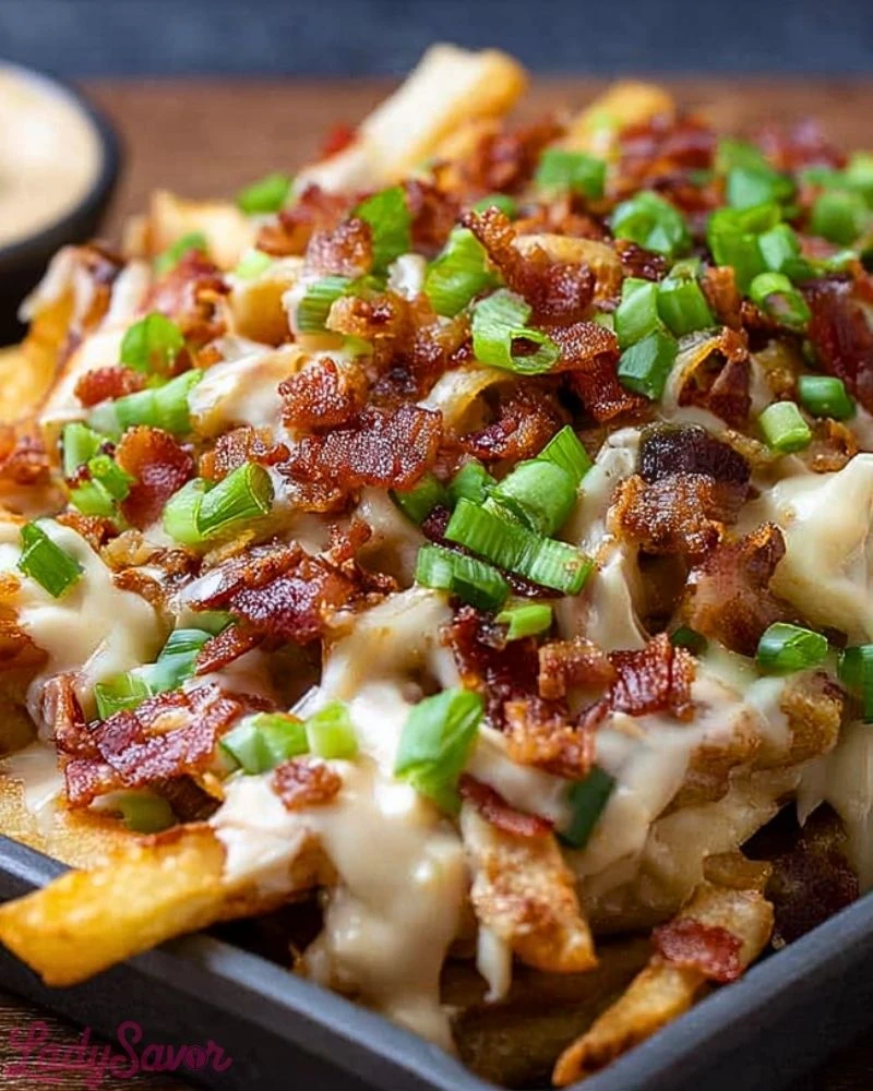 These fries aren’t just a snack—they’re an experience. They combine comfort food elements in one addictive dish: the crunch of well-seasoned fries, the creaminess of Cajun cheese sauce, and the smoky bite of bacon. Everything gets balanced with fresh green onions to cut the richness. It’s fast, fun, and flexible—perfect for both parties and low-effort dinners.