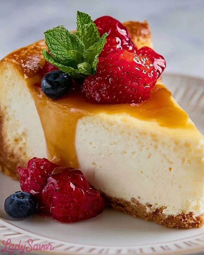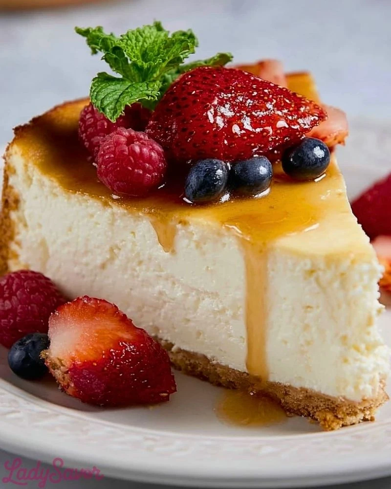 Before serving, top the cheesecake with fresh berries, a drizzle of honey or maple syrup, and mint leaves for a touch of color. Slice using a hot, clean knife for neat edges. Enjoy cold for best taste and texture.