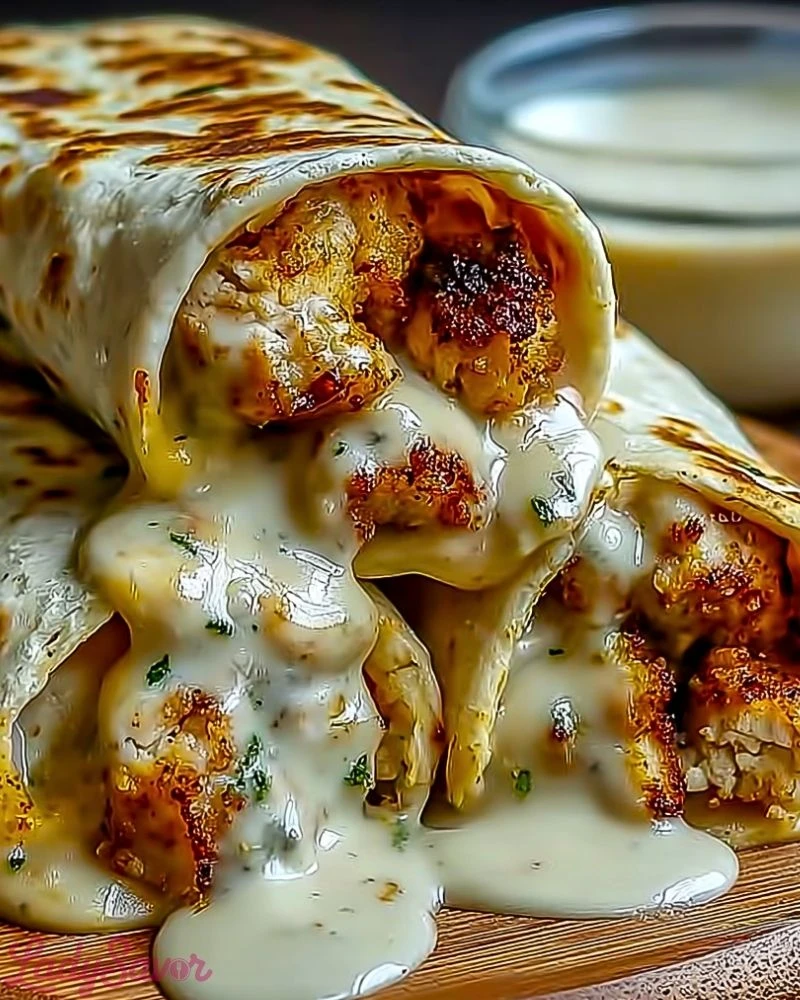 Store any leftover wraps in an airtight container in the refrigerator for up to 3 days. Keep the garlic cheese sauce separate if possible and reheat it gently on the stovetop or in the microwave, stirring occasionally. To reheat the wraps, place them in a skillet over medium-low heat or microwave for 1–2 minutes until warmed through. Avoid freezing the wraps, as the cheese sauce can separate upon thawing.