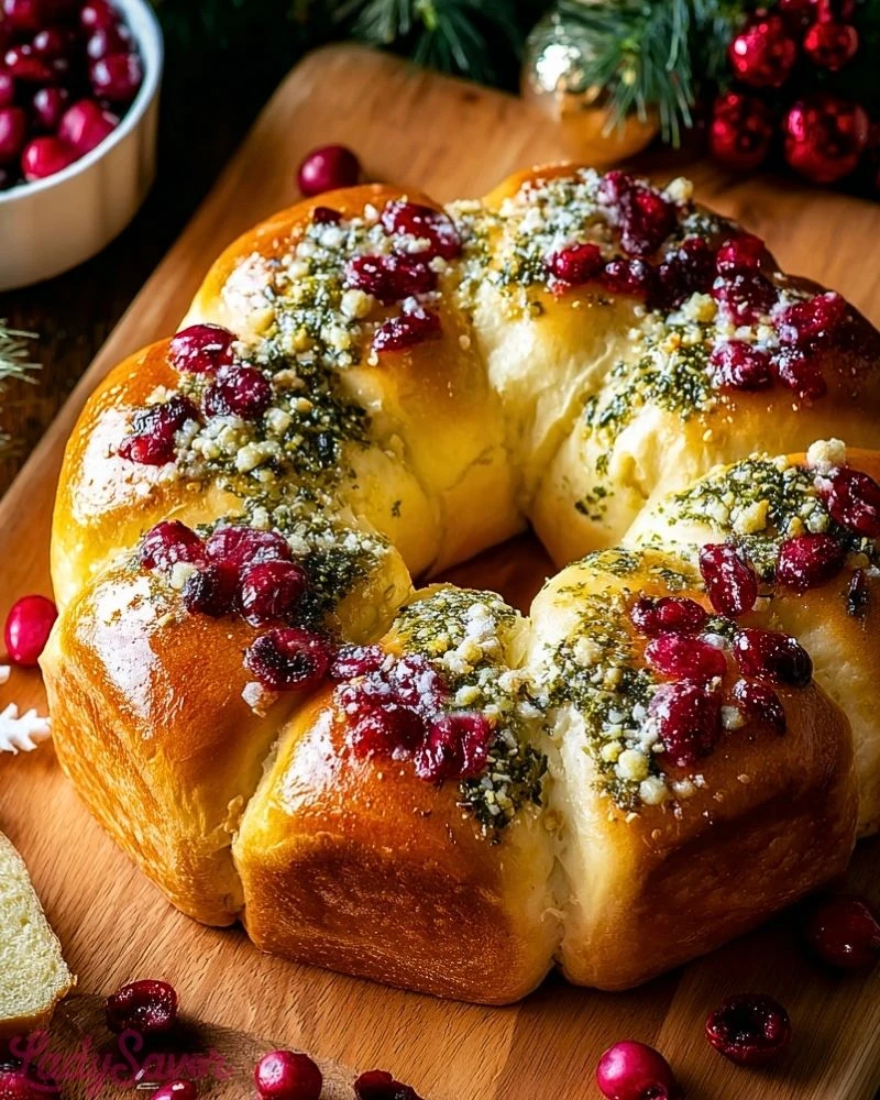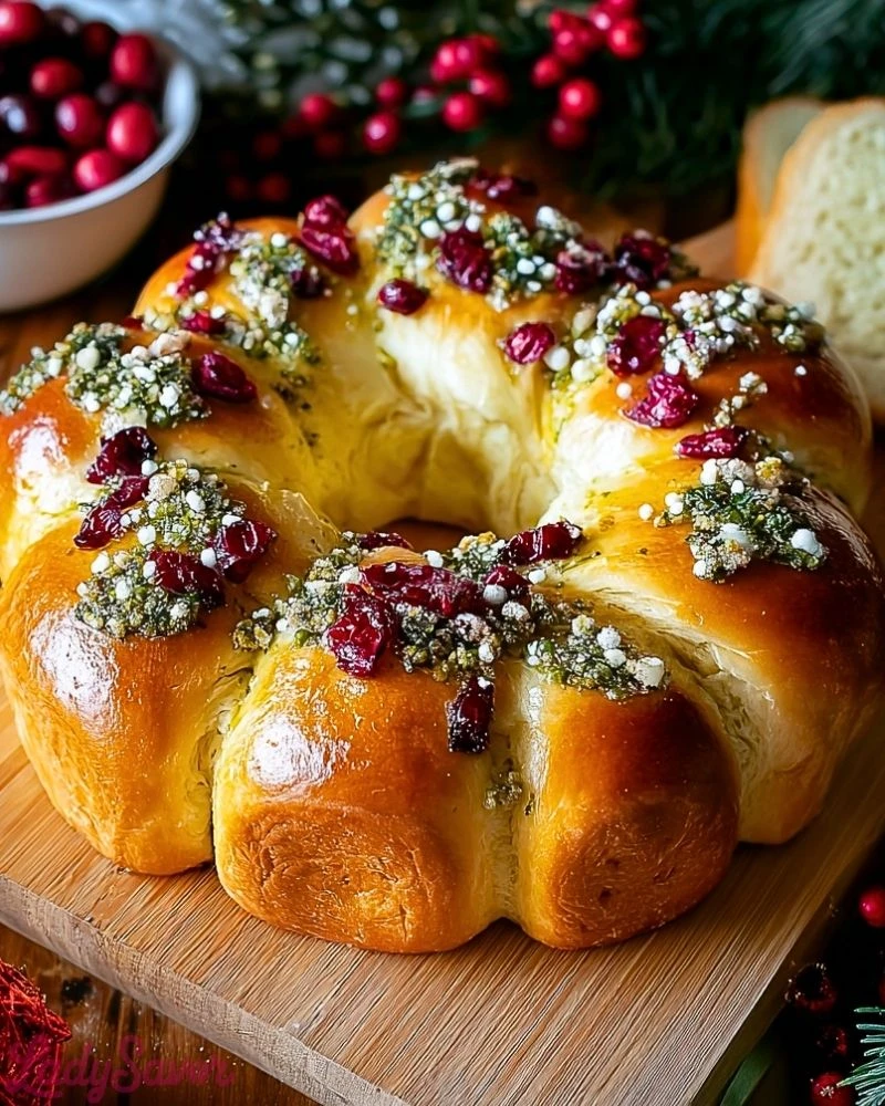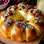 Golden, glossy, and shaped like a festive wreath, this Cranberry Orange Bread is as beautiful as it is delicious. Its soft, pillowy texture is subtly sweet, with bursts of tart cranberries and bright citrusy notes from orange zest. The decorative ring is dotted with glistening cranberries, herbaceous flecks of sugared rosemary, and festive toppings that make it the centerpiece of any holiday spread.