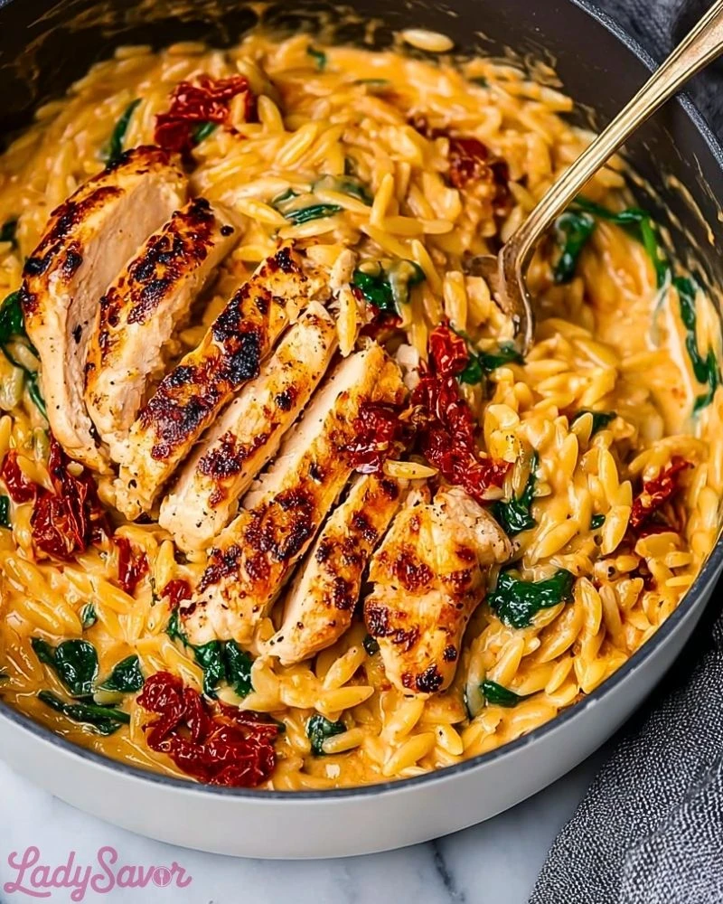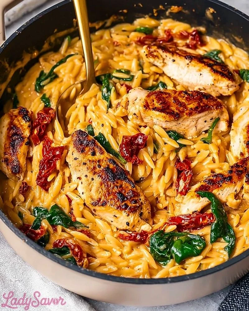 Keywords: creamy chicken orzo, sun-dried tomato pasta, one-pan dinner, easy dinner recipe, comfort food