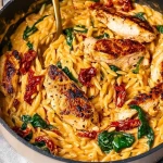 This Creamy Sun-Dried Tomato Chicken Orzo is the ultimate one-pan comfort food that’s rich, flavorful, and surprisingly easy to make. Tender chicken breasts are seared to golden perfection, then nestled in a creamy, garlic-kissed sauce infused with sun-dried tomatoes and parmesan. Orzo pasta simmers directly in the broth, soaking up every bit of flavor while spinach adds a fresh, vibrant touch. Whether you’re hunting for quick dinner ideas, creamy pasta recipes, or an easy recipe for a weeknight meal — this dish checks all the boxes. It’s perfect for cozy nights in, easy dinners, or anyone craving indulgent but balanced food ideas.