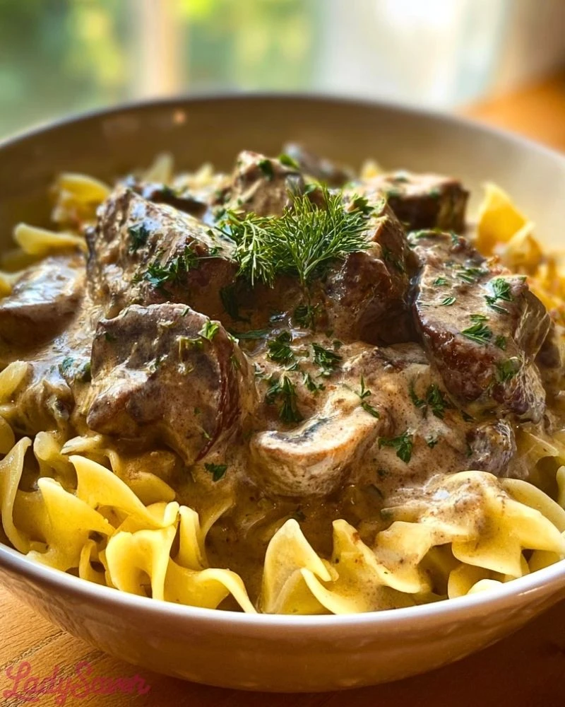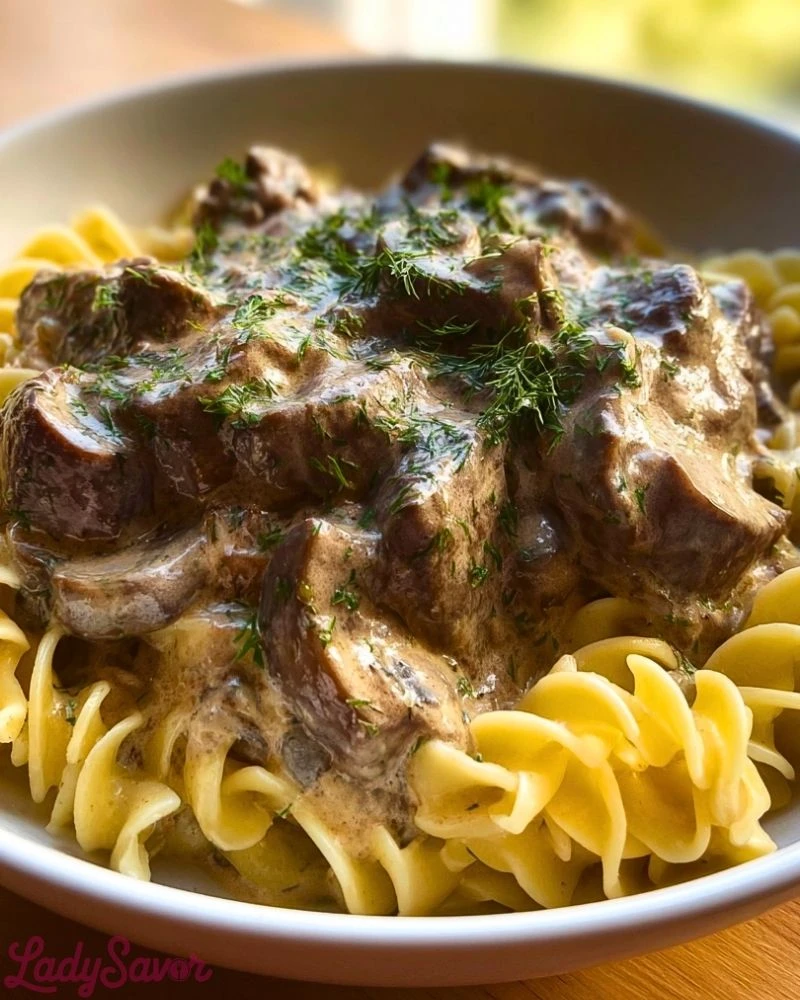 Serve the stroganoff generously over a bed of egg noodles and sprinkle with freshly chopped dill or parsley. Enjoy the comforting richness in every bite.