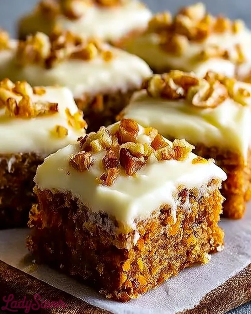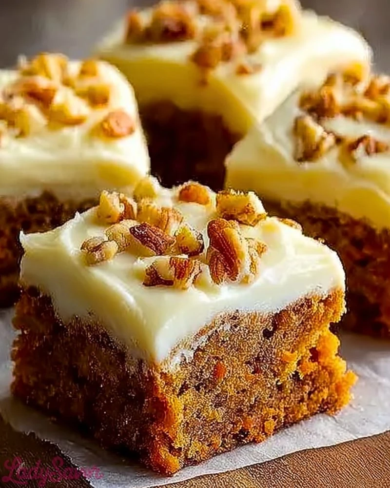 Moist, flavorful, and packed with comforting spices, these Decadent Carrot Cake Bars with Cream Cheese Frosting are everything you love about classic carrot cake, in a convenient bar form. Each bite melts in your mouth with the warmth of cinnamon and nutmeg, balanced perfectly with the rich tang of the luscious cream cheese frosting. Topped with chopped pecans for a satisfying crunch, these bars are a sweet slice of cozy indulgence.