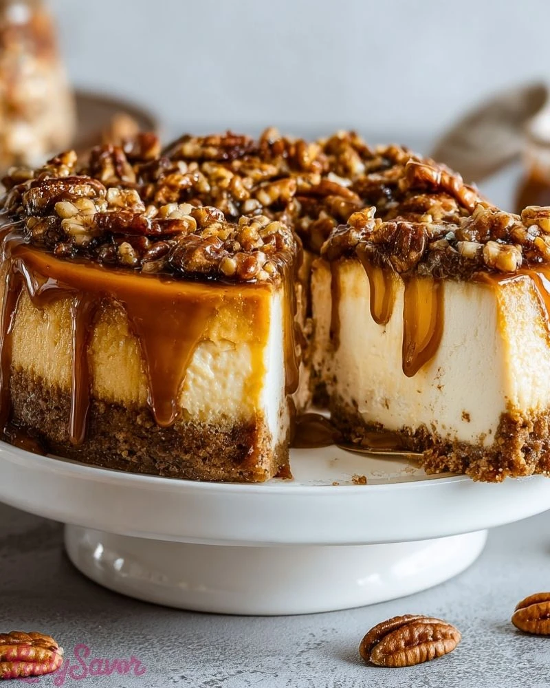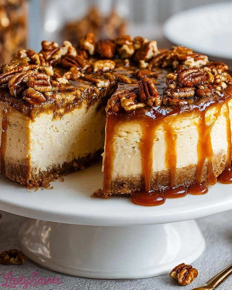 Once the cheesecake is fully chilled, spoon the pecan topping over the top. Let it sit for 10–15 minutes before serving to allow the topping to settle without sliding off.