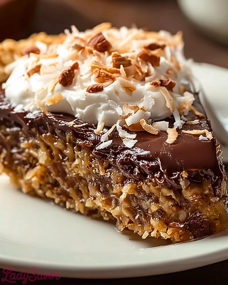 - Layers of creamy chocolate, crunchy pecans, and toasted coconut = pure bliss.
