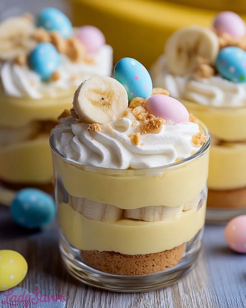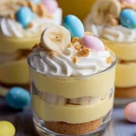 What makes these pudding cups even more delightful is how fun they are to assemble. Whether you’re hosting an Easter brunch or just want something sweet and nostalgic to end the day, this dessert hits all the right notes. It’s creamy, crunchy, fruity, and absolutely adorable with pastel chocolate eggs and banana slices on top.