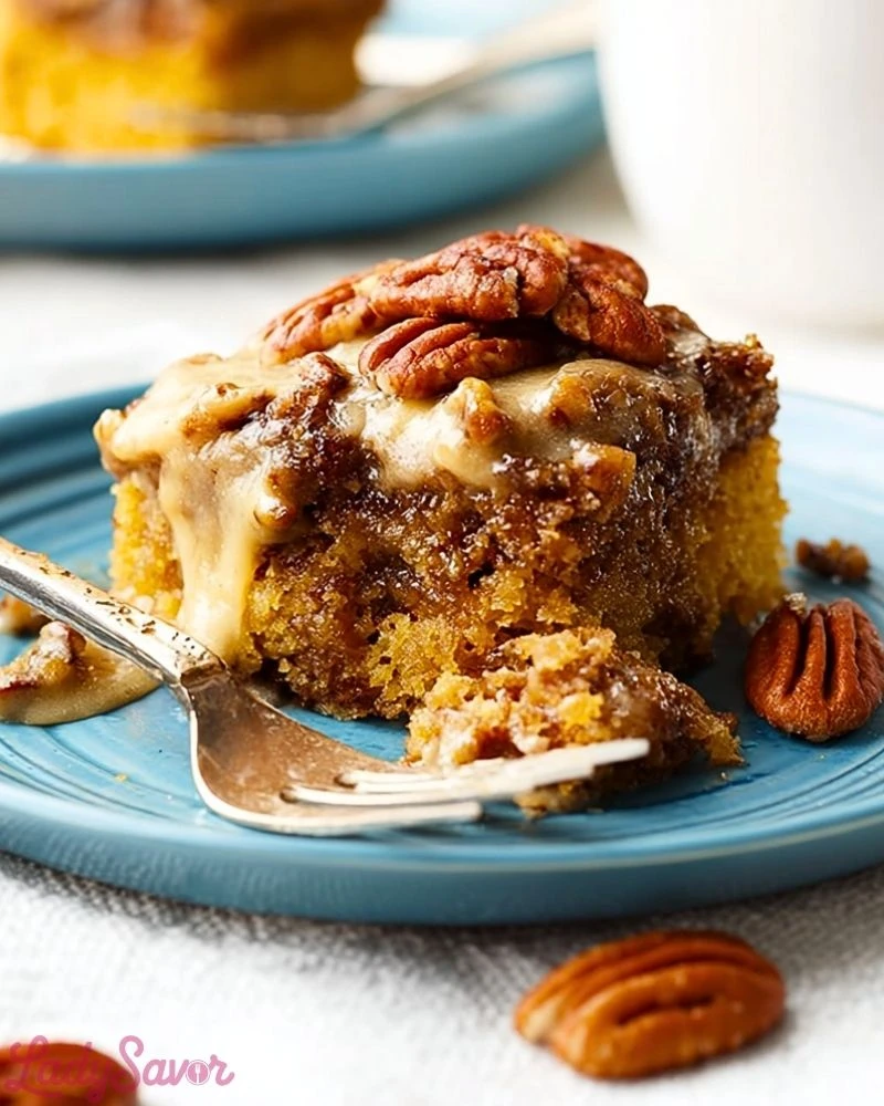 Use cold butter sliced into thin pats to help it melt evenly across the cake. If you’re adding extra pecans, toast them lightly beforehand to bring out their nutty flavor. Don’t mix the layers — the beauty of a dump cake lies in its simplicity and distinct textures. Lastly, let the cake rest for 10–15 minutes after baking to allow it to set before slicing. This makes serving much cleaner and enhances the flavor as it settles.