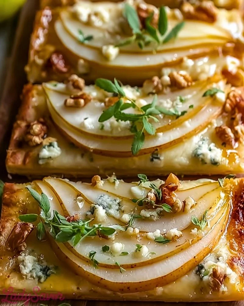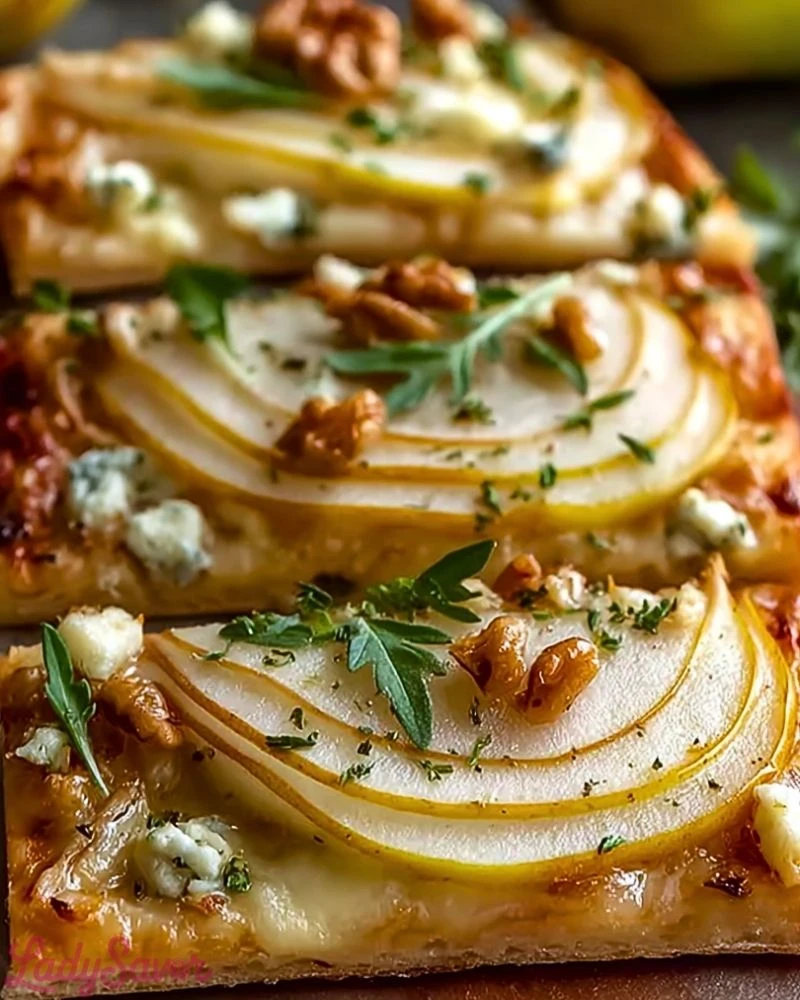 Elegant Pear & Gorgonzola Flatbread is proof that simple ingredients can come together to create something extraordinary. Whether served as an appetizer, light meal, or party dish, its gourmet appeal and delightful flavors never disappoint. With crisp edges, creamy cheese, juicy pear, and that honeyed finish—it’s a dish that will impress every time.