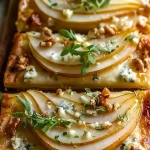 Golden, crisp flatbread topped with creamy Gorgonzola, thinly sliced ripe pears, and a drizzle of honey—this Elegant Pear & Gorgonzola Flatbread is the perfect harmony of sweet and savory. The moment you bite into it, the contrast between the creamy cheese, juicy fruit, and toasted nuts delivers a flavor profile that’s both refined and comforting.