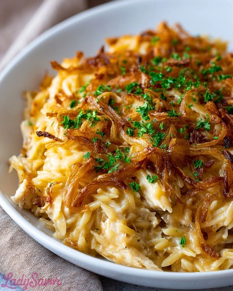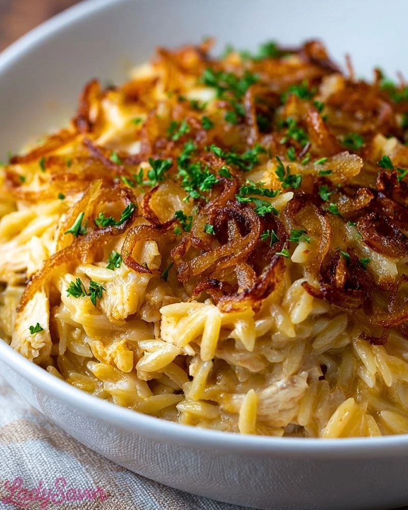 Start by caramelizing your onions low and slow—this step is key to developing the deep, sweet-savory flavor that defines the dish. Don’t rush it; the darker the onions, the richer the taste. Use boneless, skinless chicken thighs or rotisserie chicken for a quicker prep without sacrificing tenderness. Toasting the orzo in the same pan before adding the broth boosts its nutty flavor and helps it hold up during baking. Finish with a generous layer of shredded Gruyère or Swiss cheese and crispy onions for that perfect golden topping.