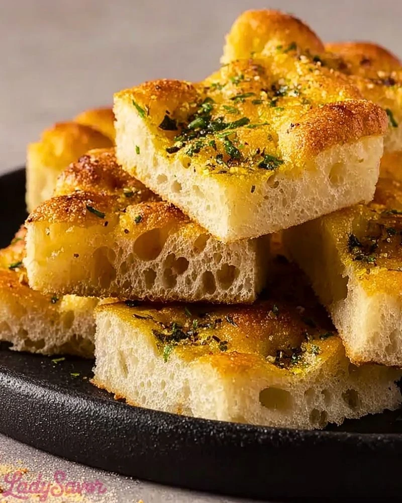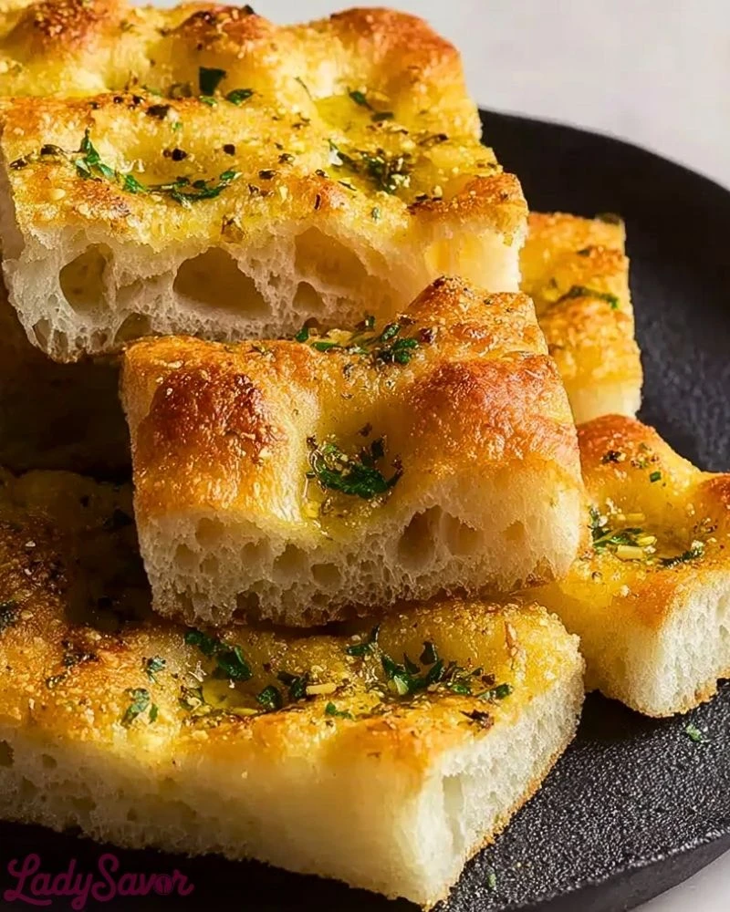 Each bite offers a perfect contrast of textures: a crispy, golden crust on top and bottom, with a soft, airy interior that springs back like a fresh pillow. The buttery garlic topping creates a savory, aromatic layer that keeps you reaching for one more piece. It’s comfort food with a touch of rustic elegance.