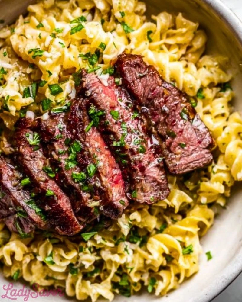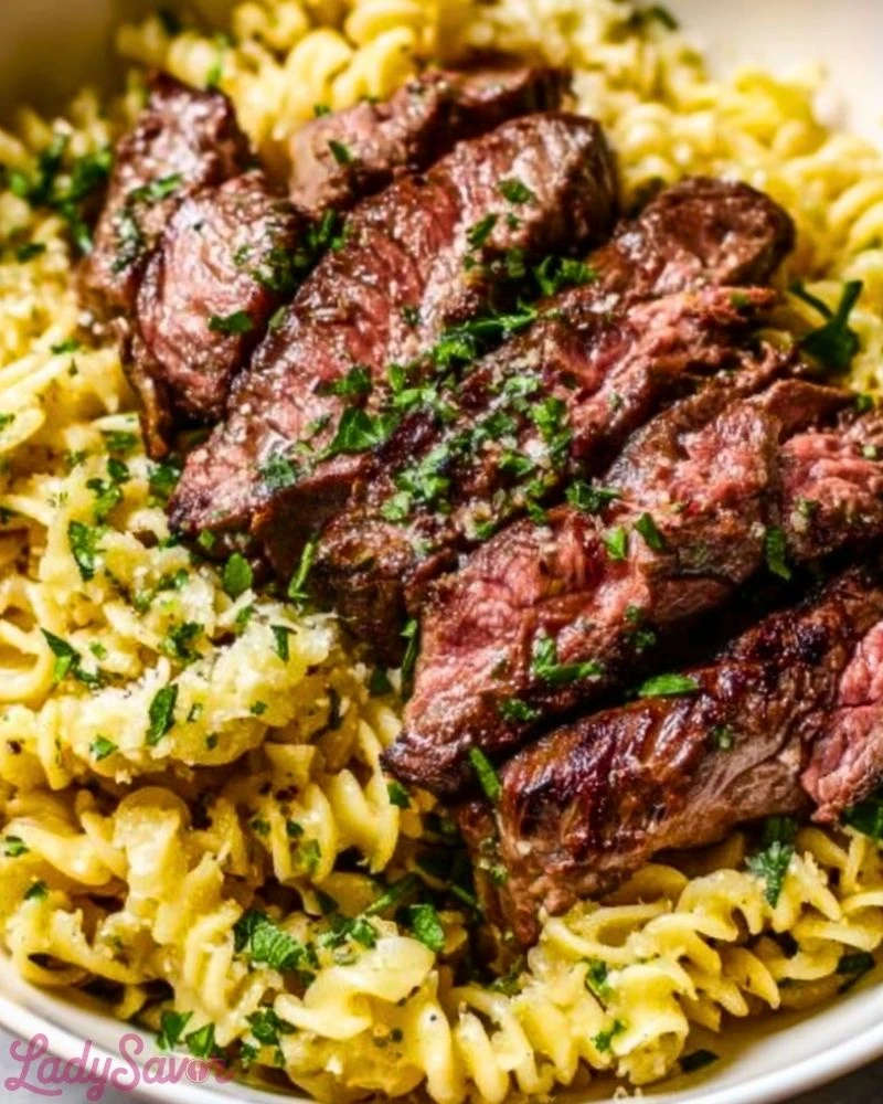 Since then, it’s become my go-to recipe for busy nights or when I want to impress without much effort. The richness of the steak, the silky noodles, and that hit of garlic and herbs create something truly crave-worthy. It’s bold, indulgent, and satisfying — the kind of meal that makes you pause after the first bite.