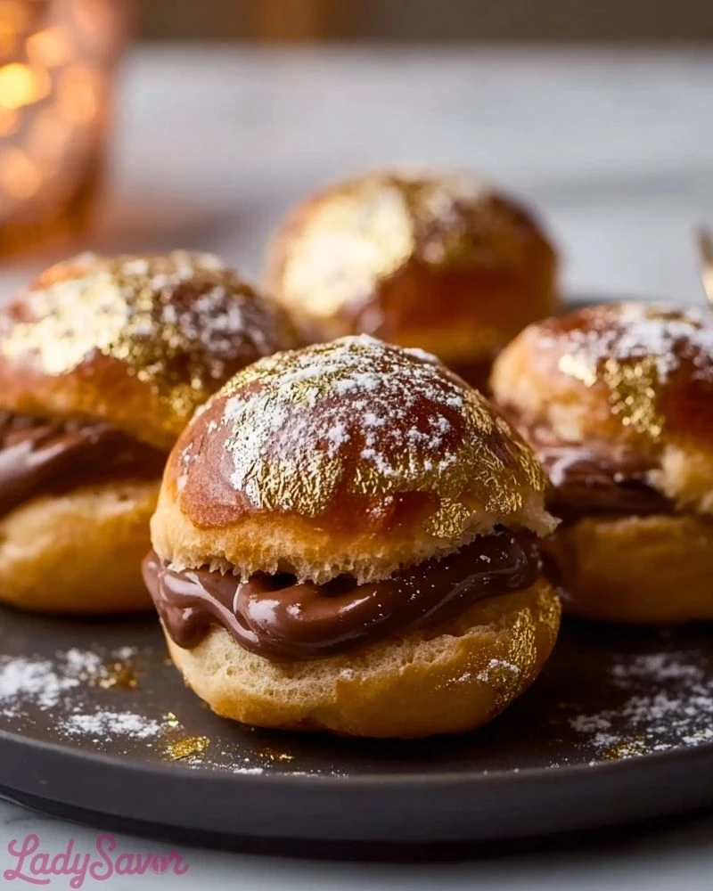 Golden, glossy, and impossibly irresistible, Gold Dusted Chocolate Profiteroles are the kind of dessert that turns a regular day into something worth celebrating. These airy, cream-filled pastries are dipped in rich chocolate ganache and delicately dusted with edible gold shimmer, creating a stunning contrast of indulgence and elegance. Each bite offers a harmonious blend of light choux pastry, velvety chocolate, and a luxurious visual flair—making it an unforgettable sweet finale to any meal.