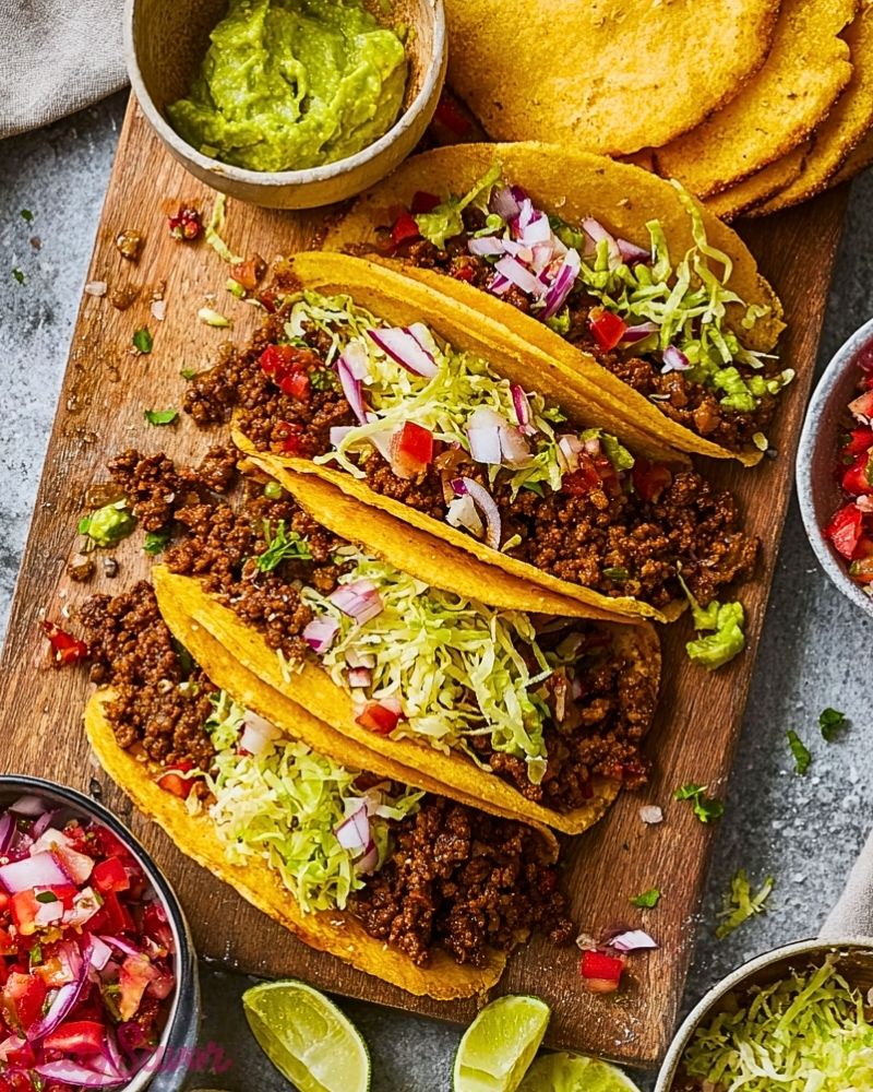 I like to keep my taco nights stress-free, so this recipe is all about simplicity without skimping on flavor. The seasoned ground beef comes together in one pan, and the toppings are endlessly customizable. These tacos bring comfort, crunch, and bold flavor to the table in less than 30 minutes—and yes, you’ll want seconds.