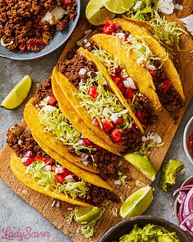 Fill each taco shell with a generous spoonful of seasoned beef. Top with shredded lettuce, diced tomatoes, shredded cheese, and any extras like pickled onions, sour cream, or guacamole. Squeeze fresh lime juice over the top if desired.