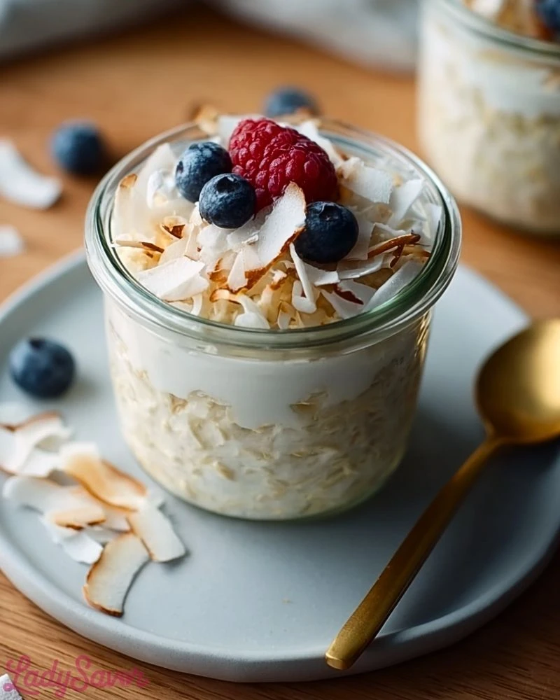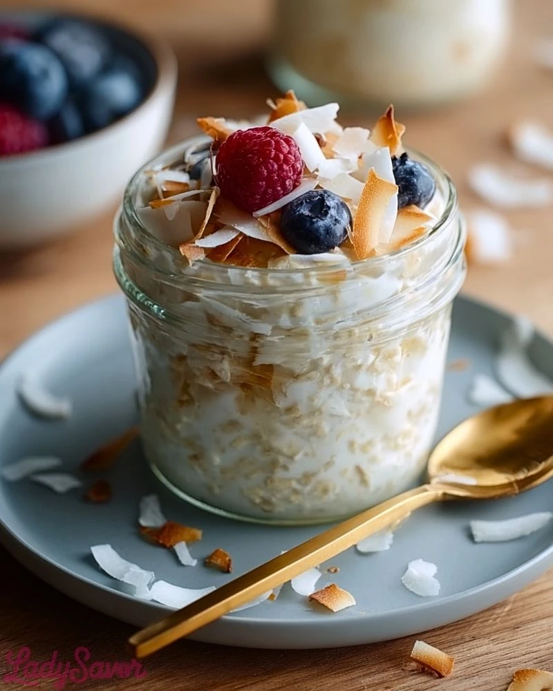 You don’t have to be a coconut fanatic to enjoy this recipe—but if you are, prepare to fall in love. The base is creamy and naturally sweet from coconut milk and yogurt, while oats soak up all that goodness overnight. It’s also highly customizable: gluten-free, dairy-free, or protein-packed, whatever your needs are. It takes just a few minutes to assemble and keeps well for days, making breakfast one less thing to stress about.