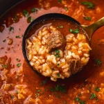 A bowl of Hearty Tomato Rice Soup is like a warm embrace on a chilly day. With tender chunks of beef, soft grains of rice, and a rich tomato-based broth, this comforting dish is perfect for when you crave something filling yet familiar. Every spoonful delivers bold flavor with a gentle tang from tomatoes and a savory depth that only slow-simmered ingredients can offer.