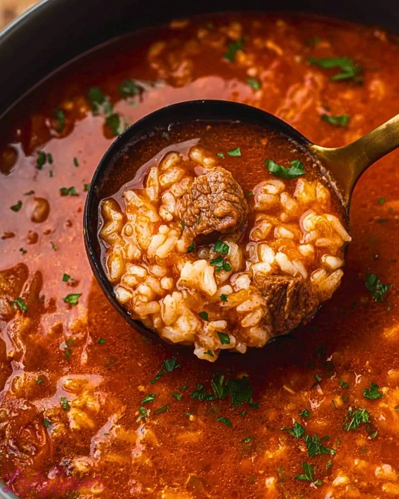 Keywords: hearty soup, tomato rice soup, beef soup, easy dinner, comfort food, rice recipes